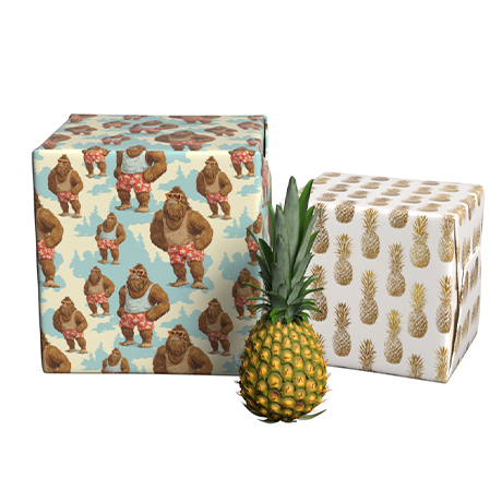 The legend goes tropical! Our beloved Sasquatch trades snow for sun in swim trunks and shades, while elegant gold pineapples bring sophisticated hospitality to the reverse. Perfect for birthdays, thank yous, housewarmings, or any celebration that needs a smile. 6 sheets of 27" x 38.5" - 43.33 sq ft total