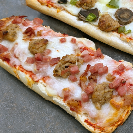 Hearty French bread pizza loaded with savory sausage, pepperoni, and ham on a bed of melted cheese and tangy pizza sauce. 8 inches of pizza satisfaction.
